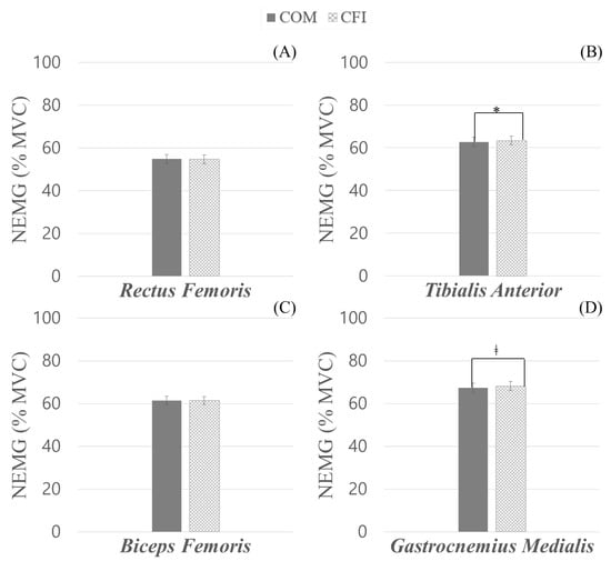 Normalized muscular activation (%) during treadmill running task from the benchmark commercial insole (COM) and carbon fiber insole (CFI). ((A) Rectus Femoris, (B) Tibialis Anterior, (C) Biceps Femoris, and (D) Gastrocnemius Medialis). Note. * indicates a statistically significant difference, and ‡ indicates a marginally significant difference.