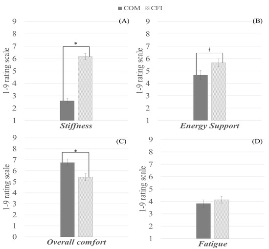 Subjective ratings after treadmill running from the benchmark commercial insole (COM) and carbon fiber insole (CFI). ((A) Stiffness, (B) Energy support, (C) Overall comfort, and (D) Fatigue). Note. * indicates a statistically significant difference, and ‡ indicates a marginally significant difference.