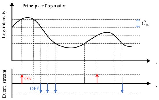 The event camera is a new bio-inspired vision sensor with the pixel structure shown in Figure 1 [1]. The pixel structure is mainly divided into three parts, including a voltage–current logarithmic conversion unit, a change amplification unit and a comparison unit. Event cameras work completely differently than traditional cameras. They do not capture images at a constant rate, but only output information about changes in local pixel brightness. The event generation process is shown in Figure 2 [2]. When the light intensity changes beyond a set threshold, the event camera marks the timestamp with microsecond time resolution and outputs the event. The event information will encode the time, position, and polarity of this change, and the event can be simply represented as a tuple , where x, y are the coordinates of the output pixel points, t is the timestamp of the event, and p is the polarity representing the luminance change (polarity information can be defined as a function shown in Equation (1) [3]).