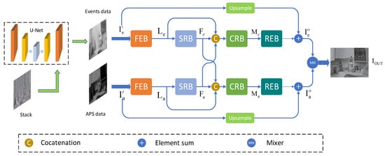 Inspired by [15], we used the basic architecture of U-Net [24] to finally include our event data in the intensity image through an encoder and decoder to facilitate the processing of event data by our subsequent network. We performed a series of encoding and decoding as well as hopping connections on the stack formed by stacking events, and finally output the intermediate intensity image . Next, we fed the intermediate intensity image data containing the event data and the APS frame data to our super-resolution network. Our super-resolution network consists of two coupled sub-networks, upper and lower, taking the processed event data and the APS frame image data as input, respectively. Each sub-network contains an initial feature extraction block (FEB), a super-resolution block (SRB), a coupled response block (CRB), and a reconstruction block (REB). The APS frame data is denoted as . The corresponding features extracted by FEB can be expressed as: