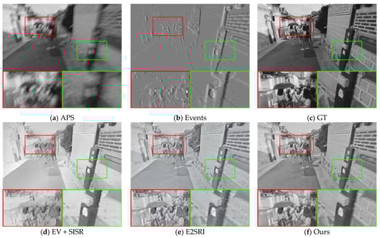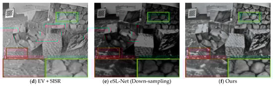 Figure 4 and Figure 5 visualize our comparison results with other methods at 2× SR and 4× SR, respectively, from a visual perspective. A comparison of the reconstruction quality of the different methods in the two scenes from the synthetic dataset shows that the event data contains more edge detail information in the scene. A comparison of the APS frames with the event stacked images in Figure 4 shows that the event data capture more information about the scene and is unaffected by blurring. Comparing the EV [15] + SISR [40] method in Figure 4 with our method, it can be seen that our method is able to reconstruct high-quality images with more continuous grayscale. This indicates that the APS frames provide more continuous grayscale information for our image reconstruction, which complements the drawback of too little event data in scenes with little change in light intensity and thus distortion of the reconstructed image.
