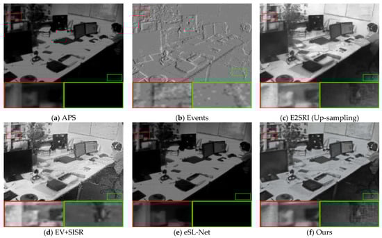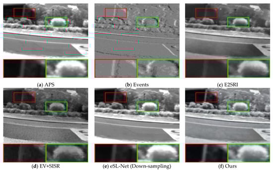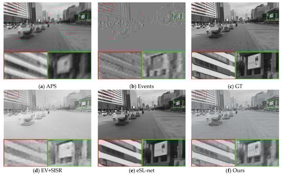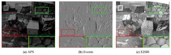 Most traditional super-resolution reconstruction methods directly reconstruct intensity images from event stream data [13,14,15,16]. However, the quality of reconstructed images is limited by the sparse nature and low resolution of event stream data, and the intensity information is ignored. Some super-resolution reconstruction methods start to use event data as an aid to super-resolve intensity images. However, due to degradation problems such as blurring and noise for various reasons, they may not produce high-quality images and cannot recover more details in the shadows of real images by using the high dynamic range properties of event data.