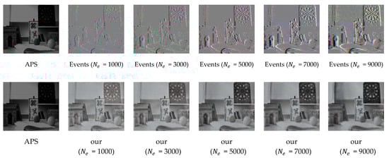 The event streams data has HDR properties and high temporal resolution. We aim to perform intensity image super-resolution reconstruction using APS frames combined with event data around the corresponding timestamps. Event streams represent sparse logarithmic intensity changes and have a completely different type of data format than ordinary intensity images. Therefore, it is not easy to fuse event data and intensity image information directly. In [34], it is stated that under ideal conditions (noise-free scenes, perfect sensor response, etc.), the integration of events produces “absolute” luminance, i.e., it is possible to integrate intensity images from event information, since events simply encode the visual content of the scene in a non-redundant way for each pixel. In addition, due to the high temporal resolution of the events, the luminance images can meet a very high frame rate for reconstruction [14].