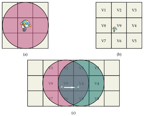 Senor view range in the grid cells: (a) sensor range cover around the robot; (b) eight cells around the robot and cell 9 is the robot position; (c) robot moving from right to left showing the sensor range does not cover the cost .