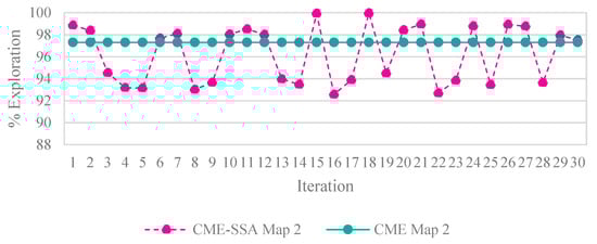 Low map coverage was recorded for the deterministic CME over the five complex maps (Figure 7, Figure 8, Figure 9, Figure 10 and Figure 11). This algorithm could not complete the full 100 iterations on any of them, possibly due to neighbor cells being occupied by obstacles and another robot. Because of the nature of the deterministic algorithm, when given a specific input, it will always produce the same output passing through the same set of states; therefore, improvement in the next iteration cannot happen. In contrast, it is evident from Figure 7, Figure 8, Figure 9, Figure 10 and Figure 11 that the proposed hybrid stochastic CME-SSA approach produces better results than the other meta-heuristic hydride techniques: CME-GWO, CME-GWOSSA, and CME-SCA.