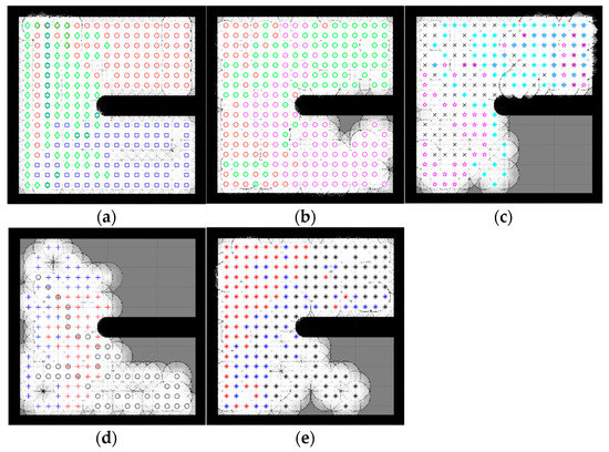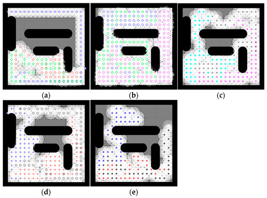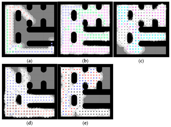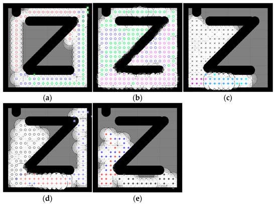 The number of runs for the five complex maps in Figure 7, Figure 8, Figure 9, Figure 10 and Figure 11 is presented in Table 8. A single run that cannot complete 100 iterations successfully due to neighboring cells being occupied by obstacles or another robot is considered a failed simulation.