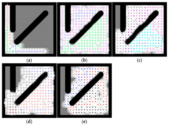 Utility value is a number assigned equally to each cell in a grid map that measures if a cell has been utilized. Every grid cell on the map has the same initial utility values. As can be seen in Equation (4), the utility values of the robots’ frontier cells decrease as they explore the map toward a new position. Robots ignore visiting cells with few utilities and only explore new positions on a map by going to grid cells with greater utility values. In order to optimize utility values, the robots look for new places they have not yet visited. The cell cost for each robot is proportional to the distance between the robot and the cell. The utility of a frontier cell depends on how many robots are migrating to it or an area nearby.