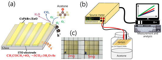In the device preparation, the ZnO nanopowder with a size of 30 nm (Gredmann, 99.9%) was first put into a furnace to anneal at different temperatures, and formed the pa-ZnO. The second step was to prepare the pa-ZnO-doped CsPbBr3 solution. In total, 0.1835 g of PbBr2 powder (Alfa Aesar, 99.9999%), 0.1064 g of CsBr powder (Alfa Aesar, 99.9999%), and 1 mL of DMSO solvent (Alfa Aesar, 99.5%) were put into beaker and stirred with 500 ppm at a temperature of 70 °C for 30 min. Then, pa-ZnO nanopowders with various weights (1, 2, 5, 10 mg) were added into the beaker and stirred with 500 ppm at temperature of 70 °C for 1 day. Next, the third step was the formation of pa-ZnO-doped CsPbBr3 perovskite film for the acetone sensor. A total of 60 mL of pa-ZnO-doped CsPbBr3 solution was spin-coated on a glass substrate with an ITO (Ruilong, 7 ohm/cm2) pattern at 5000 ppm for 30 s. Additionally, the pa-ZnO-doped CsPbBr3 perovskite film was baked on a hot plate at 100 °C for 10 min to complete the electro-resistance-type pa-ZnO-doped CsPbBr3 perovskite acetone sensor, as shown in Figure 1a.