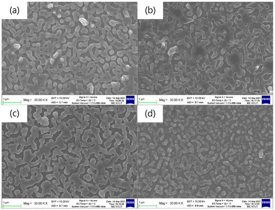 Figure 2 shows the top-view SEM images of the pa-ZnO-doped CsPbBr3 perovskite films on glass substrates. The coverages of all samples are around 83%, as estimated by Image J software. The aggregation domain sizes of the pa-ZnO-doped CsPbBr3 perovskite films, with 2 and 5 mg of pa-ZnO nanopowder doping, exhibited larger than that of the samples with 1 and 10 mg of pa-ZnO nanopowder doping, as show in Figure 2a–d. The pa-ZnO-doped CsPbBr3 perovskite films with 2 mg of the pa-ZnO nanopowder dopants had the largest aggregation domain size.