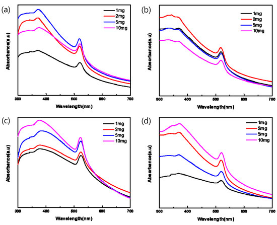 Absorption spectra of pa-ZnO-doped CsPbBr3 perovskite films with various amounts of pa-ZnO nanopowder dopants with treatment of annealing temperatures at (a) 200 °C, (b) 300 °C, (c) 400 °C, and (d) 500 °C.