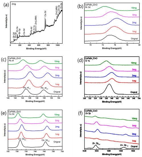 Figure 5a shows the XPS spectrum of CsPbBr3 added with 2 mg of pa-ZnO annealed at 300 °C. As shown in Figure 5b, the binding energy of Br-3d was increased from 75.21 eV of the original sample (undoped CsPbBr3 film) to 76.35 eV. As shown in Figure 5c, the binding energy of Pb-4f5/2 increased from 149.87 eV of the original sample to 150.97 eV, and the binding energy of Pb-4f7/2 increased from 144.97 eV of the original sample to 146.11 eV. As shown in Figure 5d, the binding energy of O-1s increased from 539.04 eV of the original sample to 540.11 eV. As shown in Figure 5e, the binding energy of Cs-3d5/2 increased from 731.68 eV of the original sample to 732.56 eV, and the binding energy of Cs-3d3/2 increased again from 745.65 eV of the original sample to 746.61 eV. As shown in Figure 5f, the binding energy of Zn-2p3/2 increased from 1029.22 eV of the original sample to 1030.78 eV. The binding energy of Zn-2p1/2 was increased from 1052.36 eV to 1054.07 eV to compare with the original sample. Therefore, it can be found that when 2 mg of pa-ZnO is added, for any different atoms, the binding energy is increased in comparison to the original sample, which is the highest in all samples. The phenomenon of this binding energy displacement may be that when the atoms are oxidized, the bond energy will be enhanced, and the oxidation will increase the binding energy of the inner layer electrons. The more electrons that are lost during oxidation, the greater this increase, and the peak position of the O-1s is related to the oxygen vacancies of the crystal lattice. It can be seen that, compared with the original sample of XPS spectra, the intensity after annealing has a downward trend, and it is known that the annealing heating causes oxygen vacancies [25,26].