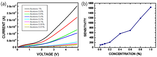 Figure 6 plots the current-voltage (I–V) characteristics of the pa-ZnO-doped CsPbBr3 perovskite acetone sensors with the treatment of annealing at various temperatures and pa-ZnO doping amounts. The sensitivity, S, can be used to estimate the performance of the gas sensor [5,27]: