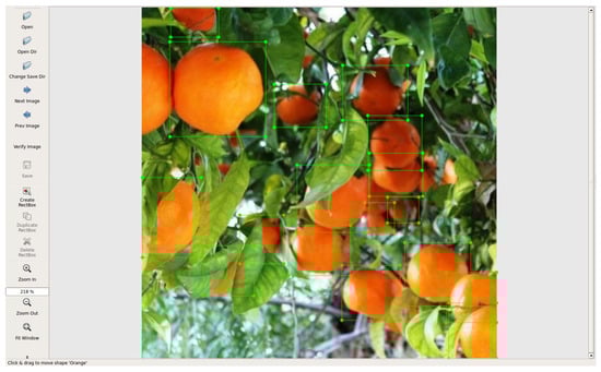 We initially established a dataset to work towards this goal. Our choice was to use a custom-made dataset. We created it by initially downloading images from the Internet through the Google Images search engine. Then, we used the open-access tool labelImg [] to create the annotations for this custom dataset in the Pascal VOC format. Figure 2 displays how this process works. We annotated oranges in 120 images for training and 40 for validation. Although this initial number of images is not very large, it was enough to establish a proof-of-concept for later development stages.