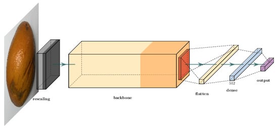 All three models were used to obtain a better classification potential considering the dataset used in Silva et al. []. The structure of the prediction model starts with a normalization layer for a three-channel image. Then, the data flow through the model backbone. Finally, the output of the backbone is flattened and goes through a dense layer with 512 neurons. The output is a dense layer with a “softmax” activation function. Figure 4 illustrates how we employed these backbones to build our model.