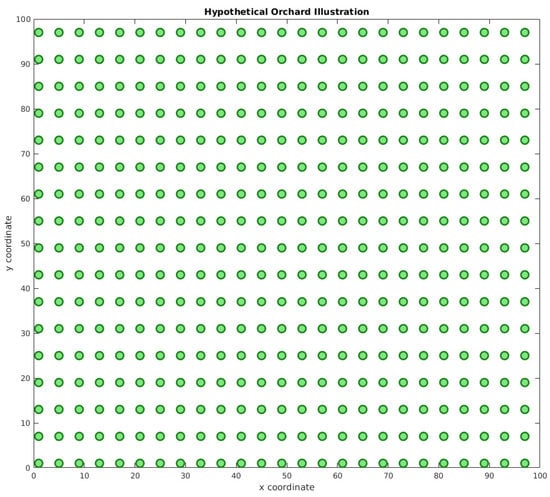 Hypothetical orchard illustration. The hypothetical orchard has 425 trees within a 1 ha area, separated into a 4 m × 6 m grid. The x and y coordinates represent the distance in meters.