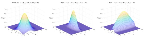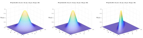 From the second perspective, we experimented with the function containing the correlation term . For this, we employed the complete version of the probability function, given in Equation (1). Table 7 displays the parameters chosen for the following part of this experiment. Furthermore, Figure 15 displays the behavior of these distributions in space. As the figure shows, they slightly differed from the behaviors shown in Figure 12 due to the correlation term.