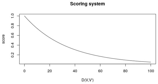 This score is helpful, as when the values of V and are very similar, it comes closer to 1. Nonetheless, as it goes further away, the value asymptotically approaches 0 as the distance increases. The denominator is thought to dampen the score decay as the distance increases. Figure 8 illustrates this scoring system.