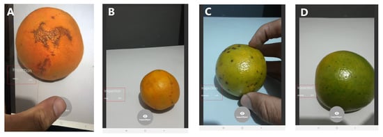 In the literature, there are some works for detecting citrus with YOLO. Good accuracy was achieved by applying this method in edge computing, using the NVidia Jetson Xavier NX Hardware, in []. Other authors showed that YOLO-LITE ran at about 21 FPS on a non-GPU computer and at 10 FPS after being implemented on a website with only seven layers and 482 million FLOPS. This speed was 3.8-times faster than the fastest state-of-art-model, SSD MobilenetV1 []. Thus, we decided to use YOLO to implement the mobile devices for object detection, integrating a mobile application.