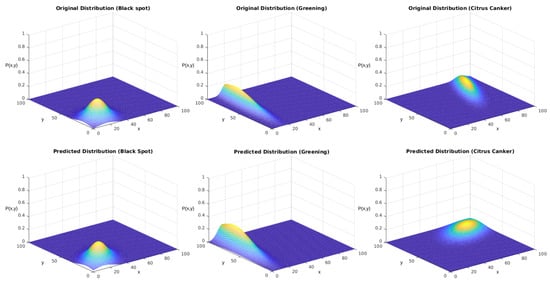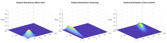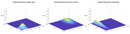 The value of this maximum density can reach up to even 50% of the fruits []. It represents a probability function instead of a probability density function, as it is normalized by the maximum density of diseased fruits observed in the orchard. We can initially work starting from data with zero correlation for simplification purposes. Thus, the previous equation was simplified to Equation (2), representing non-correlated coordinates: