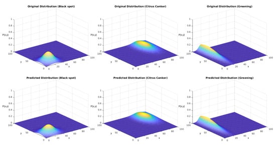 The standard deviations parameterize the above equation among the x and y axes (,), the correlation between the two variables (), the mean value on each axis (,), and the maximum disease density (). These parameters allow determining the disease distribution according only to its spatial coordinates , using a Gaussian parametric model.