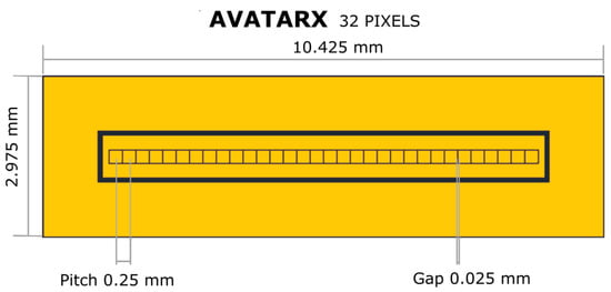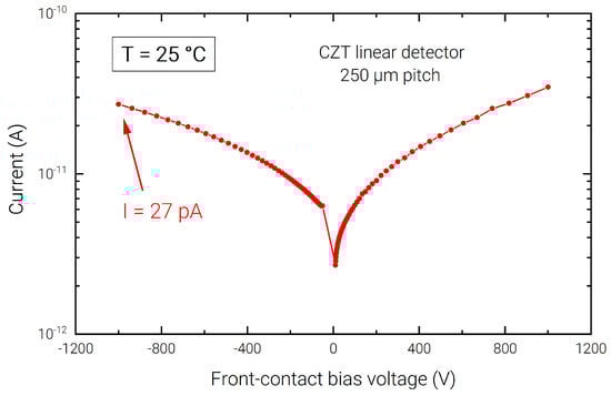 The detector is based on a CZT crystal (2.95 × 10.40 × 1.10 mm3) grown by the boron oxide encapsulated vertical Bridgman (B-VB) technique [15]. The detector layout is characterized, on the back side (anode), by a linear array of pixels with 250 µm pitch and inter-pixel gap of 25 µm (Figure 1); an internal (500 µm width) and external guard-rings, surrounding the pixels, are used to minimize charge sharing events, and the surface and periphery leakage currents, respectively; the detector’s front-side (cathode) is a uniform planar electrode covering the whole surface, acting as entrance window of the incoming radiation for the following characterization, allowing a faster collection of holes generated by low-energy photons. The detector uses quasi-ohmic gold contacts ensuring low leakage current at room temperature (Figure 2) [16,17,18]. The pixel (anode) capacitance was evaluated to be ∼100 fF using Comsol Multiphysics simulation software [19], taking into account the total contributions due to the front-side contact (cathode), neighboring pixels, and guard rings.