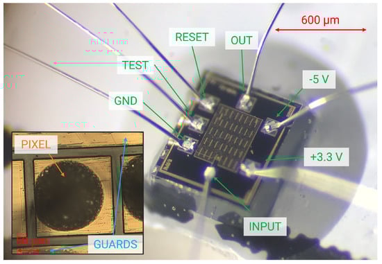The detector array was glued on one side of a test printed circuit board (PCB) and arranged to face the collecting pixel toward a narrow slit in the PCB. The other side of the PCB was used to accommodate the SIRIO high-speed CMOS charge sensitive amplifier (Figure 3) [13], working in pulsed reset configuration [20], optimized for minimum noise performance at deep sub-microsecond shaping times for low-capacitance detectors (<100 fF) [21,22,23]. The SIRIO preamplifier has an area occupation of 600 × 650 µm2 and has a conversion gain of 40 mV/fC, with a power consumption 15.3 mW/channel, including the integrated line-driver.