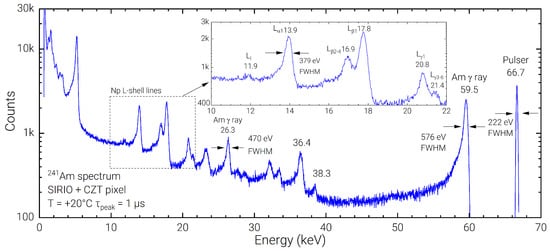 Using the Amptek PX5, the SIRIO-CZT system has been characterized at the optimum peaking time (1 µs). In Figure 5 the resulting Am spectrum of a 1-h acquisition is shown. The linewidth at room temperature of 576 eV FWHM (0.97%) on the 59.5 keV line confirms a state-of-the-art spectroscopic resolution performance, which lowers to 523 eV FWHM (0.88%) if the low-energy tailing is excluded, with a FWHM of 222 eV (20.5 el. rms) on the pulser line. Even with a non-optimal peak-to-background ratio of ≃20 ÷ 1, the low-noise performance of the acquisition systems allows to clearly resolve the Np Lα, Lβ and Lγ lines in the 10–22 keV energy range of the Am spectrum, visible in the inset of Figure 5. In the lower energy range (<6 keV), the presence of some spurious lines, resembling a scaled version of the Am spectrum, is observed; this effect, currently under investigation, could be due to a partial induction on the pixel under test from the signal charge collected in the neighbor electrodes (guard and pixels) that, even with a net zero area, could still cause a wrong detection in the MCA logic.