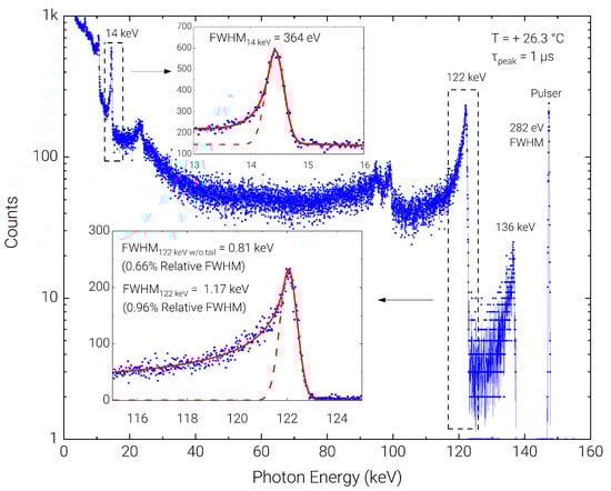 Using the Amptek PX5 DPP, 1-h acquisitions were performed with the Am source at the shortest available peaking times (50 and 100 ns), to further back the results of stability over time performance of the detection system even in presence of ballistic deficit pulse processing [37]. Measurements showed 774 eV FWHM on the 59.5 keV line (377 eV FWHM on the pulser) for the 50 ns peaking time and 744 eV FWHM (309 eV FWHM on the pulser) for the 100 ns peaking time acquisition. In Figure 7, it is shown that even at 32 ns peaking time with the Dante DPP, the energy resolution on the 59.5 keV line is 1.3% (782 eV FWHM), with 412 eV FWHM on the pulser line, a performance which is still among the best results present in recent scientific literature, obtained using longer shaping times in the µs range [38,39,40]. Using the Co source at 50 ns peaking time, the measured FWHM at 122 keV is 2.13 keV (1.75%) which is mostly limited by the significant low-energy tail that, at this fast shaping time, lowers the peak-to-background ratio down to 4 ÷ 1.