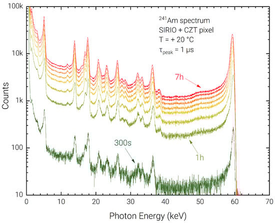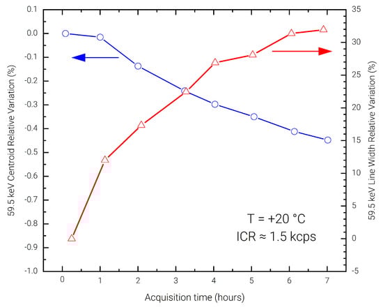 In order to evaluate the presence of the bias-induced polarization phenomena in the detector, a long measurement of 7 h was performed using a low input photon count-rate of ≃1 kcps, without depolarizing the detector and with intermediate acquisitions every hour. The acquired spectra are reported in Figure 8. The stability of the spectra in terms of charge collection efficiency and energy resolution is evident across the complete acquisition. In Figure 9 the 59.5 keV peak shift and FWHM degradation are reported with respect to a reference 5-minute acquisition performed at the start of the 7 h. It can be noted that the peak shift is contained with 0.45%, which determines a FWHM deterioration of less than 35%.