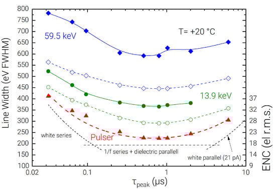 - Bertuccio, G.; Pullia, A. A method for the determination of the noise parameters in preamplifying systems for semiconductor radiation detectors. Rev. Sci. Instrum. 1993, 64, 3294–3298. [Google Scholar] [CrossRef]