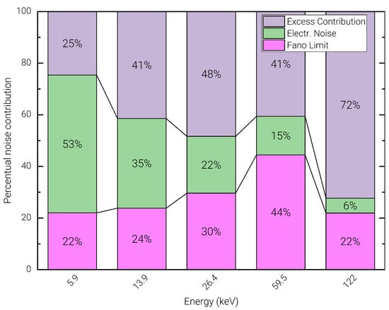 This effect can be attributed mostly to the charge sharing on the uncollimated pixel, trapping noise, and ballistic deficit related to signal components associated to the holes, which are not accounted for in the pulser line width. These causes produce a characteristic left-hand-side tailing on the acquired spectral lines and contribute to a relatively poor peak-to-background ratio observed across all spectra. Such tailing effects are more prominent in the lines associated to high energy photons, which are stopped deeper inside the detector volume [42]. This allows inferring that the presented spectroscopic performance could be further improved by applying appropriate corrections in the spectral reconstruction using time coincidence analysis, or depth of interaction correction techniques as widely discussed in the scientific literature of detection systems with imaging capability [43,44]. Figure 10 also shows the decomposition of the experimental data in terms of series and parallel noise components, represented using black dashed lines. In Figure 11 the measured FWHM at different photon energies is divided into the percentual contributions arising from the Fano noise (pink), the electronic noise as measured on the test pulse line (green), and the excess contribution (purple). This breakdown allows observing that the electronic noise is the dominant contribution only for the 5.9 keV line. At medium energies (13.9 keV, and 26.4 keV) the Fano contribution increases significantly, becoming the dominant contribution for the 59.5 keV line. However, on the 122 keV line, the excess contribution becomes by far the most important contribution, showing that the obtained raw resolution is still significantly limited by the transport characteristics of the detector’s material and by the geometrical dimensions of the pixel [24].