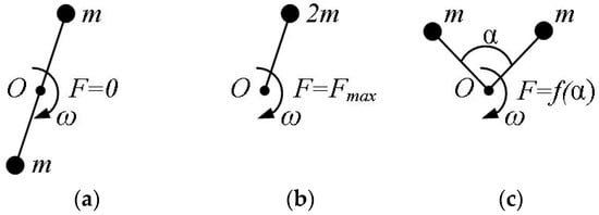 In the first case (Figure 1a), the unbalances rotate in the antiphase, and the disturbing force is zero. In the second case (Figure 1b), the unbalances rotate in phase, and the disturbing force is maximal. In the third case (Figure 1c), the disturbing force is determined by the expression: