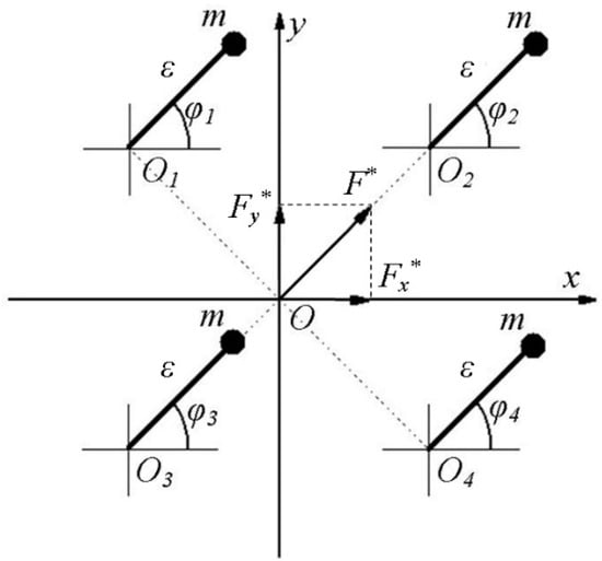 Let us consider a system consisting of 4 unbalanced vibration drives (Figure 2). For the simplicity of exposition, we will assume that the masses m and eccentricities ε of all unbalances are the same, and their axes of rotation O1–O4 are located symmetrically to the origin of coordinates O.