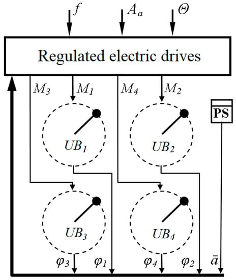 Thus, by controlling the angular positions of the four unbalanced electric drives in accordance with the dependencies (3), it is possible to separately control the frequency, amplitude, and direction of the vibration. The functional scheme of the four unbalanced vibration exciters is shown in Figure 3, where f, Aa, and  are the specified frequency, amplitude, and direction of the vibration; M1 … M4 are the engine torques; UV1 …UV4 are the unbalanced vibrator; AS is the accelerometer (acceleration sensor);  are the unbalance angles; and  is the acceleration of the unbalanced vibration exciter.