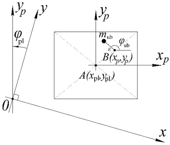 The position of the movable platform (Figure 4) in the nonmoving coordinate system is given by the coordinates of its center of mass,  (point A), and the angle of rotation relative to the specified center of mass, . The position of the unbalance rotation axis (point B) is specified in the moving coordinate system , the axes of which are rigidly connected to the platform, and the origin of the coordinates is at point A.  and  are the coordinates of a point in a moving coordinate system.