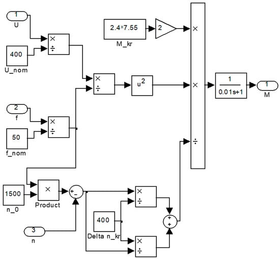 In this paper, the simulation model was supplemented with a description of a frequency-controlled asynchronous electric drive. The simulation model of an asynchronous motor (AM) based on the simplified Kloss formula in the MATLAB Simulink software environment is shown in Figure 5. To take into account electromagnetic transient processes, it was proposed to use an aperiodic link of the first order. For AM P = 1.1 kW, f = 50 Hz, cos = 0.78, n = 1390 rpm, and U = 400 V, the values of the parameters of the mathematical description are as follows: Mcr = 2.4·7.55 H∙m, absolute slip corresponding to the critical moment Δncr = 400 rpm, and synchronous speed n0 = 1500 rpm. In order to confirm the adequacy of the proposed mathematical description of the electric drive, mathematical modeling and a physical experiment were carried out for a motor controlled by a frequency converter, while the frequency reference of the converter changed every 0.5 s for two fixed values—30 and 32 Hz.