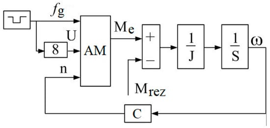 The block diagram of the simulation model of an asynchronous electric drive with a variable jump in setting the power supply frequency is shown in Figure 6, where  is the given frequency; AM is the asynchronous motor;  is the resistance moment; and C is the speed encoder coefficient.