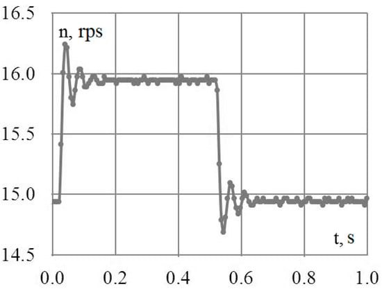 During the physical experiment, pulses with a period of 1 s and a duty cycle of 50% were applied to the input of the frequency converter. The upper level corresponded to a rotation frequency of 16 rps, and the lower level corresponded to 15 rps. The three-phase variable-frequency power supply voltage from the output of the converter was fed to the asynchronous motor, the shaft of which, in turn, was connected to the encoder. The signal from the encoder was recorded using an oscilloscope in the form of an array. Further, the received data were processed in Excel in order to determine the time intervals during which 100 encoder pulses were received. Based on the obtained values, the instantaneous speed of the motor shaft was determined. The results of mathematical modeling and physical experiment are shown in Figure 8 and Figure 9.