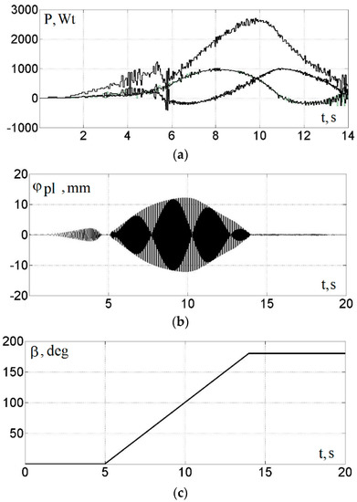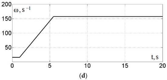 In the process of modeling, in the interval 0–1 s, the launch was carried out at a given synchronous angular velocity,  = 15.7 s−1, and parameter,  = 0°. After, the acceleration took place during which the given synchronous angular velocity, , increased to 157 s−1. Then, at a constant , parameter  within 9 s linearly increased from 0 to 180°.