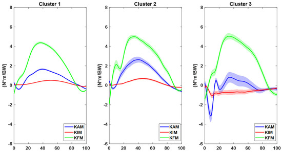 Knee kinetics clusters based on Haar wavelet collected in laboratory. Data are normalized over the stance phase of the change of direction and are presented as mean (solid lines) and standard deviation (shadow). Abbreviations: KAM = knee abduction moment (blue, negative: abduction); KIM = knee internal rotation moment (red, negative: external); KFM = knee flexion moment (green, negative: extension).