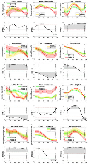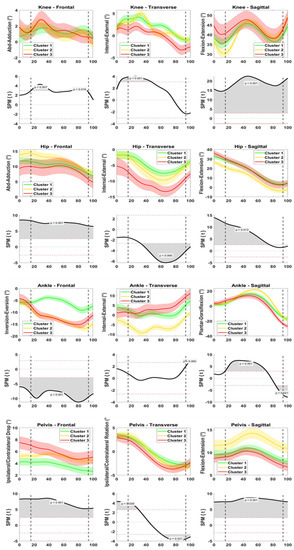 At the knee joint, differences among the clusters were found on the transverse plane after IC (20–40% of the time window) and at TO and on the sagittal plane during all the time window (Figure 3). Cluster 3 exhibited lower knee internal rotation (p = 0.003) and lower knee flexion than the other clusters (p < 0.001).
