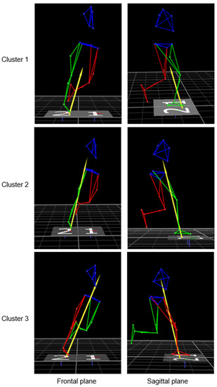At the hip joint frontal plane, hip abduction at IC differed among the three clusters differently from the F-EX (greatest in Cluster 3, lowest in Cluster 2, p < 0.001, Figure 3). Cluster 3 exhibited greater hip external rotation (p < 0.001) and hip extension than the other clusters (p < 0.025).