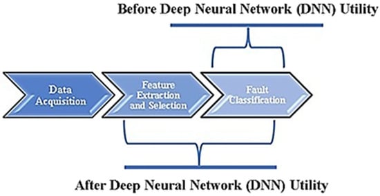 The deep neural network (DNN) strategy encompasses hierarchically stacked neural layers that obtain input information from the user. With the raw data as input, the deep learning network understands the structural makeup of a complex data set, enabling it to ‘learn’ the most significant set of features through several layers. The term ‘deep’ is used to suggest that the information received as input in the form of raw data is not just passed on to a single successive layer for further processing but is rather allowed to percolate through numerous levels of layered procedures. In effect, deep learning has the potential to present disruptive benefits over traditional machine learning and statistical approaches in fault diagnosis and condition monitoring. The application of DNN in the condition monitoring and fault diagnosis domain has remained in its premature stages for a considerable time. However, increasing efforts are being made to deploy neural network advantages to resolve a wider variety of challenges. A deep statistical feature learning approach for diagnosing bearing and gearbox conditions based on statistical features extracted in the frequency, time and time-frequency domains was proposed by Li et al. [