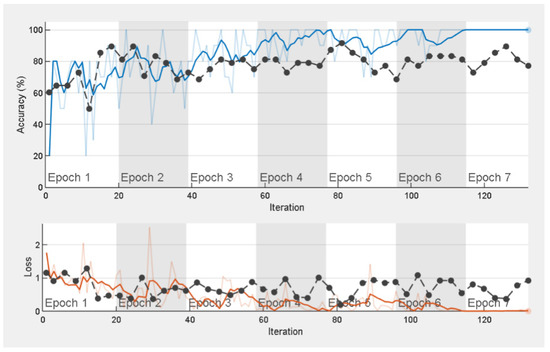Figure 6. As the training progress curve saturates by flattening after the sixth epoch, it could be interpreted that the ResNet-50 pretrained network adopted for this study has been trained effectively, and model weights have been successfully upgraded. Additionally, the overall reduction of data losses during the process of network training (in general, for all networks under study) suggests that the optimal choices of hyperparameters have been obtained.