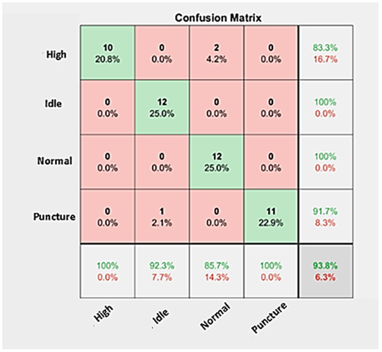 Figure 7 shows that the ResNet-50 architecture yielded a classification accuracy of 93.80% with no misclassification instances except for Normal (two instances were misclassified as High) and Idle (one instance was misclassified as Puncture), which could have instantiated due to poor signal quality, interruption by noise and discrepancy in similarities between the acquired signals. In summary,