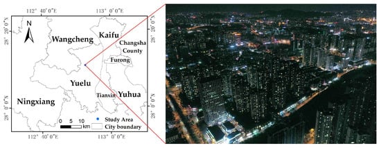 The study area is located in Meixihu Street, Yuelu District, Changsha City, Hunan Province, China, mainly including Meixihu Jinmaoyue, Baijiatang, Longqin Bay, Zhenye City and Jiajing, etc. The area has uniform and regular distribution of building height and high community management level, and is a typical urban center community. The images were acquired during the period of 20:00–20:30 at night in May 2022, which is the peak of human nocturnal activity and is representative. Some of the parameters of the UAV were set as shown in Table 1, and the monocular shooting method with fixed vertical takeoff and landing was used to obtain the city night tilt image containing red, green and blue bands (Figure 1). A clear time without wind and clouds was chosen for the shooting to ensure the accuracy.