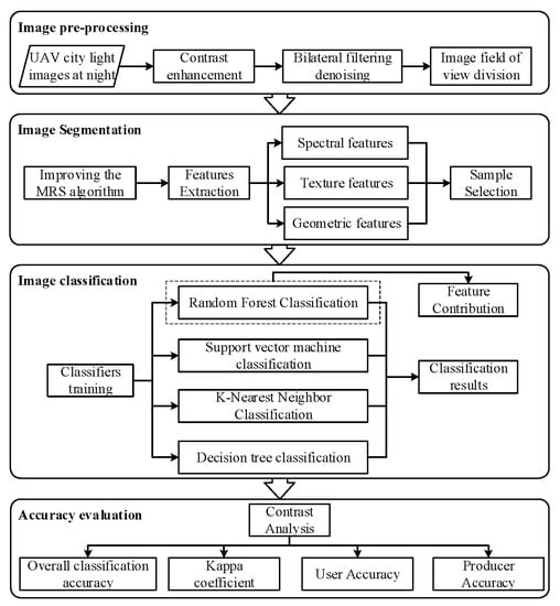 In this study, a classification method of urban night lights based on static monocular tilted UAV visible images is proposed which uses object-oriented approaches and machine learning algorithms. The classification process mainly consists of the following four steps (Figure 2): (1) pre-processing of UAV images; (2) image segmentation and extraction of feature information; (3) image classification, using RF, SVM, KNN and DT classifiers to classify urban nighttime lights; (4) classification accuracy evaluation, selecting the four indexes of OA, kappa coefficient, UA and PA to evaluate the classification accuracy and analyze the accuracy of different machine learning algorithms and light types.