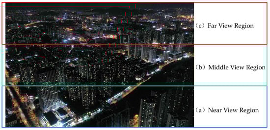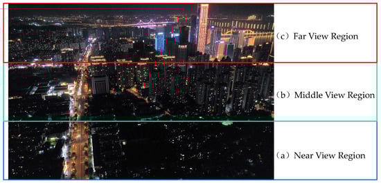 Static monocular tilt image is a single-view tilt image taken at a certain height using a single-lens UAV with a fixed vertical takeoff and landing, which has the problem of continuous variable scale, where the spatial resolution of the image becomes gradually smaller along the direction of the field of view and the size of the same type of light in the image varies very much, which has a certain impact on image segmentation and classification. Therefore, in this paper, before image segmentation, the images were equally divided into three images in the near, middle and far view regions according to the view direction (Figure 3), which effectively alleviated the continuous variable scale problem. The subsequent image segmentation and classification operations were based on the near, middle and far view regions.