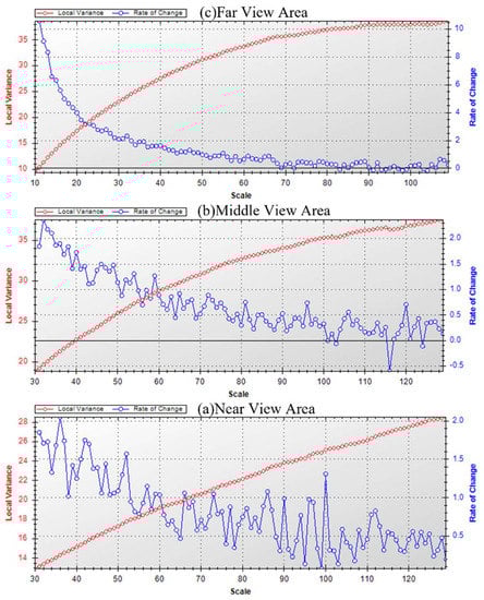 In this study, the band weights were set to one. The specific segmentation process was as follows: firstly, keeping the scale parameter constant, the shape factor and compactness were segmented in steps of 0.1 and iterated through 0.1–0.9 for multiple segmentation experiments to determine the optimal parameters of both; secondly, the ESP2 plug-in was used to determine the potentially suitable scale parameter (Figure 4), and the final scale parameters were determined by visual interpretation; finally, the optimal segmentation parameter settings for different regions were obtained (Table 4).