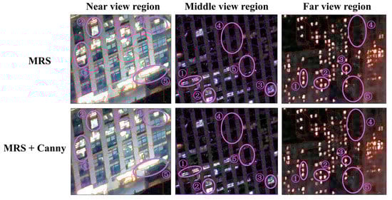 In this paper, we incorporated Canny edge detection results based on multiresolution segmentation to alleviate the over-segmentation phenomenon of some lighting types. From comparing the segmentation results before and after combining Canny edge detection (Figure 5), it was difficult to segment all light types perfectly using only the multiresolution segmentation algorithm, and there was over-segmentation of a window light into multiple window lights (e.g., in the near view region of Figure 5 using only the area marked by circle ①, ② and ③ in MRS), the existence of a halo around the window light (e.g., in the near view region of Figure 5 using only the area marked by circle ④ in MRS) and over-segmentation of the building reflective light and background into multiple objects (e.g., in the middle view region of Figure 5 using only the area marked by circle ④ and ⑤ in MRS). The Canny edge detection can detect the edge contours of all kinds of lights with a low error rate and as much as possible, so the combination of the two makes the extraction results more consistent with the real contours of all kinds of lights. As can be seen from the selected ① ② ③ region in Figure 5, after combining Canny, the over-segmented window light was re-segmented into a complete window light, making the interior of individual window lights more complete and more homogeneous. Additionally, from the ④ ⑤ region selected in Figure 5, we can see that after the combination of the two, the segmentation result of the building reflective light and background was more regular and smoother, which is more in line with the actual situation. The segmentation results in this paper further validate the feasibility of the combination of the two types of algorithms for the application of UAV nighttime urban lighting images.